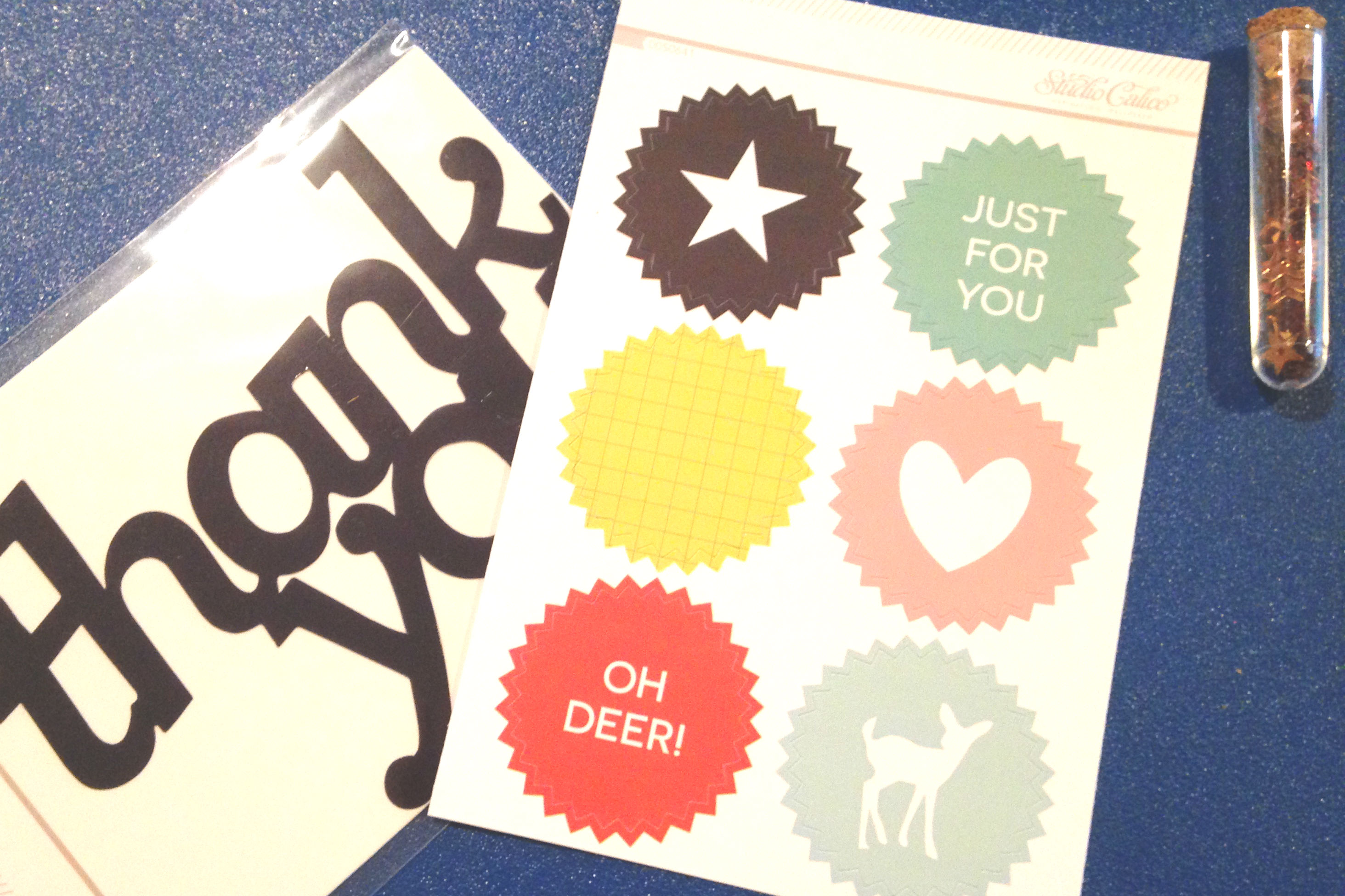 Embellishments #1 from September 2015 Studio Calico Stationery Kit – acrylic “Thank You” and pinked edge sticker seals